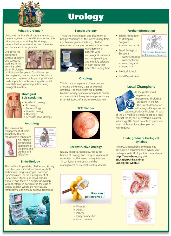 The poster below provides basic information about general urology, its sub-specialty areas and its historical origins. You can download a high-res version for display in your own clinical areas, and find out more about careers in urology (from NHSHE) by using the links below: