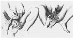A strong and intelligent person being seated on a high stool, lays hold of the patient in a supine posture, with his back towards him, and his hips being placed on his knees, with his legs drawn backwards he orders the patient to seize his own hams with his hands, and to draw them towards his body with all his power, and at the same time he secures them in that position. Then the physician, having carefully pared his nails, introduces his index and middle fingers of the left hand, first the one gently, afterwards the other into the anus, and places the fingers of his right hand lightly on the lower part of the abdomen. First of all the stone must be sought for about the neck of the bladder and when it has been brought into that position a lunated incision must be made through the integuments immediately over and extending to the neck of the bladder near the anus, with the horns a little inclined towards the ischia; then a second incision is to be made in the transverse form in the convex part of the wound so as to open the neck of the bladder.