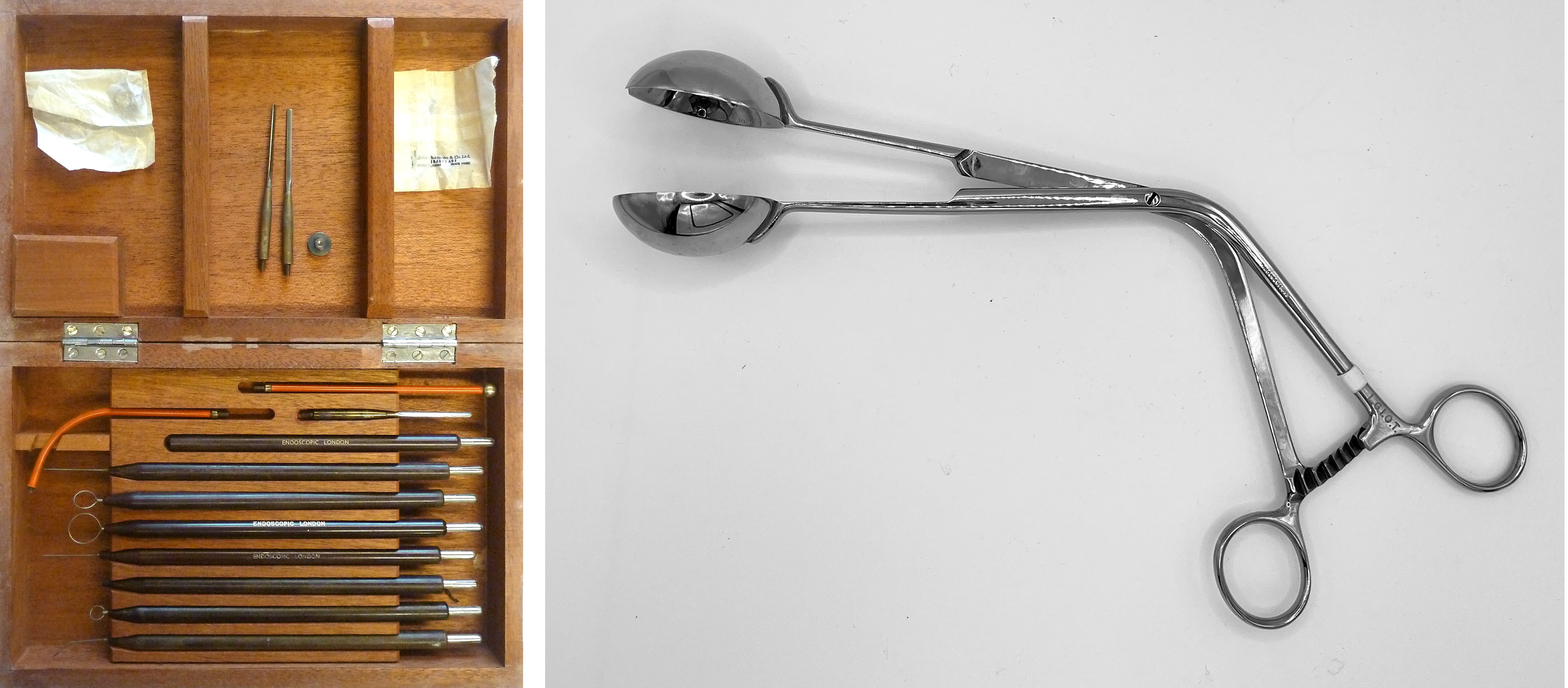 In the mid-20th century, bladder tumours were diagnosed endoscopically and treated by resection or fulguration (probes shown above left). followed by a regime of "check cystoscopies". Early bulb cystoscopes did not have very clear views and often papillary tumours were removed through open cystotomy. Special forceps (above right) were introduced by JD Fergussen in 1949 to grasp tumours whilst excising them with hand-held diathermy points.