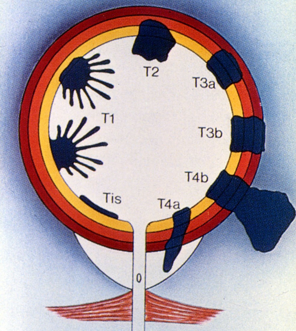 What rationalised the management of bladder cancer was a protocol for bladder cancer that allowed more specific treatment based on tumour stage & grade. This became mainstream with the introduction of TNM staging (T-staging pictured right) in the late 1940s, which was later adopted by the Union for International Cancer Control (UICC). Together with the Jewitt-Strong-Marshall anatomical staging system developed in the 1980s, this greatly improved prediction of prognosis.