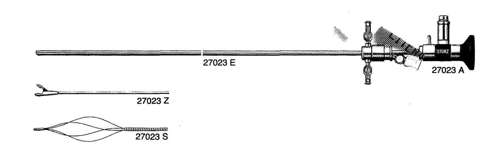 Perez-Castro uretero-renoscope by Karl Storz with Dormia stone extraction basket (and stone forceps)